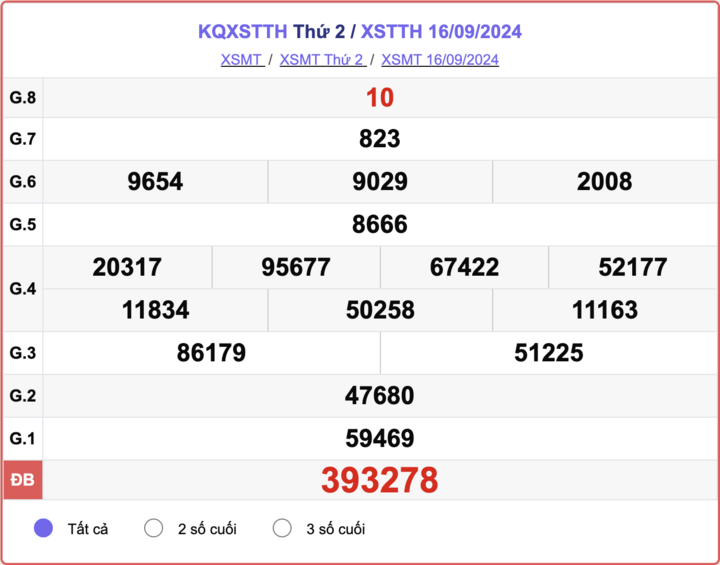 XSTTH 30/9. Kết quả xổ số Thừa Thiên Huế hôm nay - XSTTH thứ Hai ngày 30/9/2024 sẽ được cập nhật nhanh chóng và chính xác nhất trên phuongtruongan.vn. Kết quả các giải thưởng XSTTH ngày 30/9/2024 sẽ được cập nhật liên tục từ giải nhất cho đến giải tám, cuối cùng là giải đặc biệt.