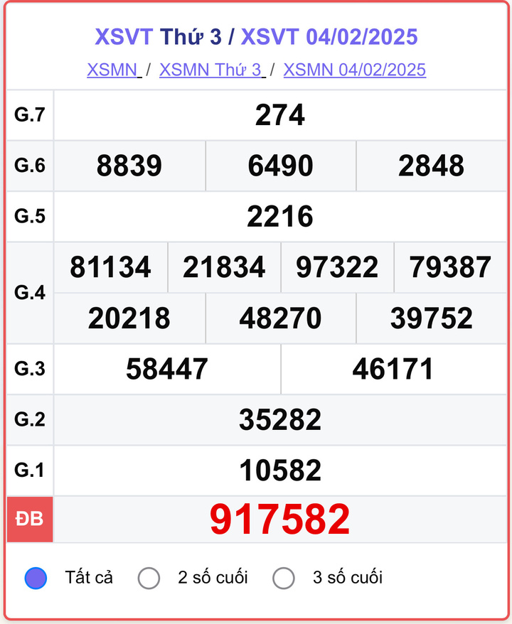 Xem lại Kết quả xổ số Vũng Tàu Thứ Ba ngày 4/2/2025