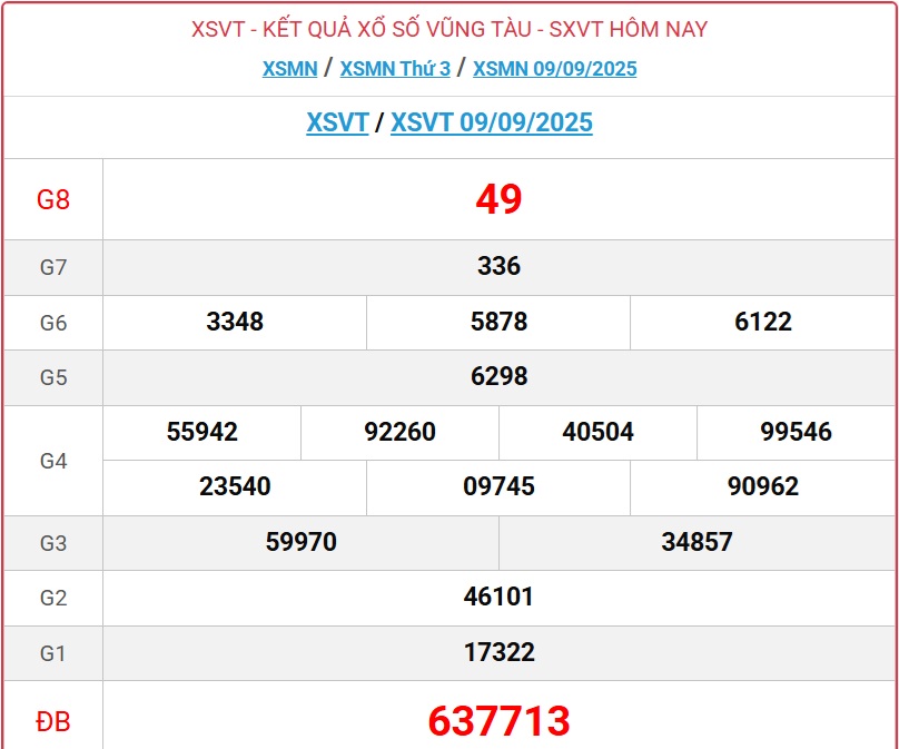 XSVT 30/9. Kết quả xổ số Vũng Tàu hôm nay 30/9/2025 được quay vào lúc 16 giờ 15 phút vào ngày thứ ba hàng tuần, mở thưởng bởi Công ty Xổ số kiến thiết Vũng Tàu và bắt đầu từ giải tám cho đến giải nhất, cuối cùng là công bố giải đặc biệt.