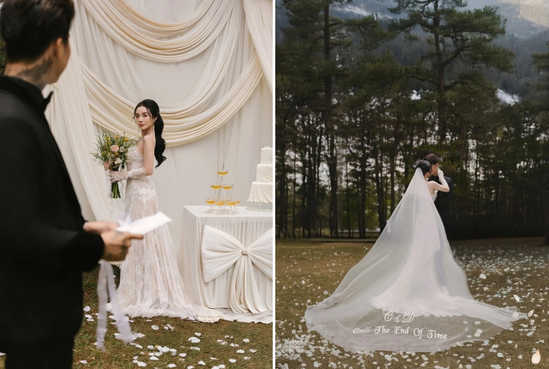 Bộ đôi đầu tư lớn vào bộ ảnh cưới với nhiều hoa tươi. Váy cưới của Bảo Ngọc cũng được thiết kế riêng. Ở phần tà dài hơn 2 m là dòng chữ thêu tinh tế "Until the end of time" cùng tên viết tắt của hai người. Vợ Đạt G chia sẻ bộ ảnh kèm chú thích: "Ở đây hôm nay chính thức có hai con người/ Giàu sang hay sa cơ vẫn luôn giữ môi cười/ Bữa cơm yên vui bên nhau là điều đầu tiên/ Hãy nhớ luôn trao cho nhau nhiều sự hồn nhiên"