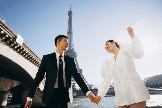 Midu chọn trang phục theo phong cách đơn giản của nhà mốt Tạ Thùy Tiên, đầu gắn thêm khăn voan. Cô và vị hôn phu dạo bước dưới chân tháp Eiffel.