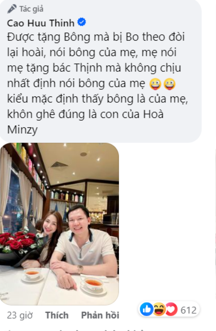 "Được tặng bông mà bị Bo theo đòi lại hoài, nói bông của mẹ, mẹ nói mẹ tặng bác Thịnh mà không chịu, nhất định nói bông của mẹ. Kiểu mặc định thấy bông là của mẹ, khôn ghê, đúng là con của Hoà Minzy", bác sĩ Thịnh chia sẻ.