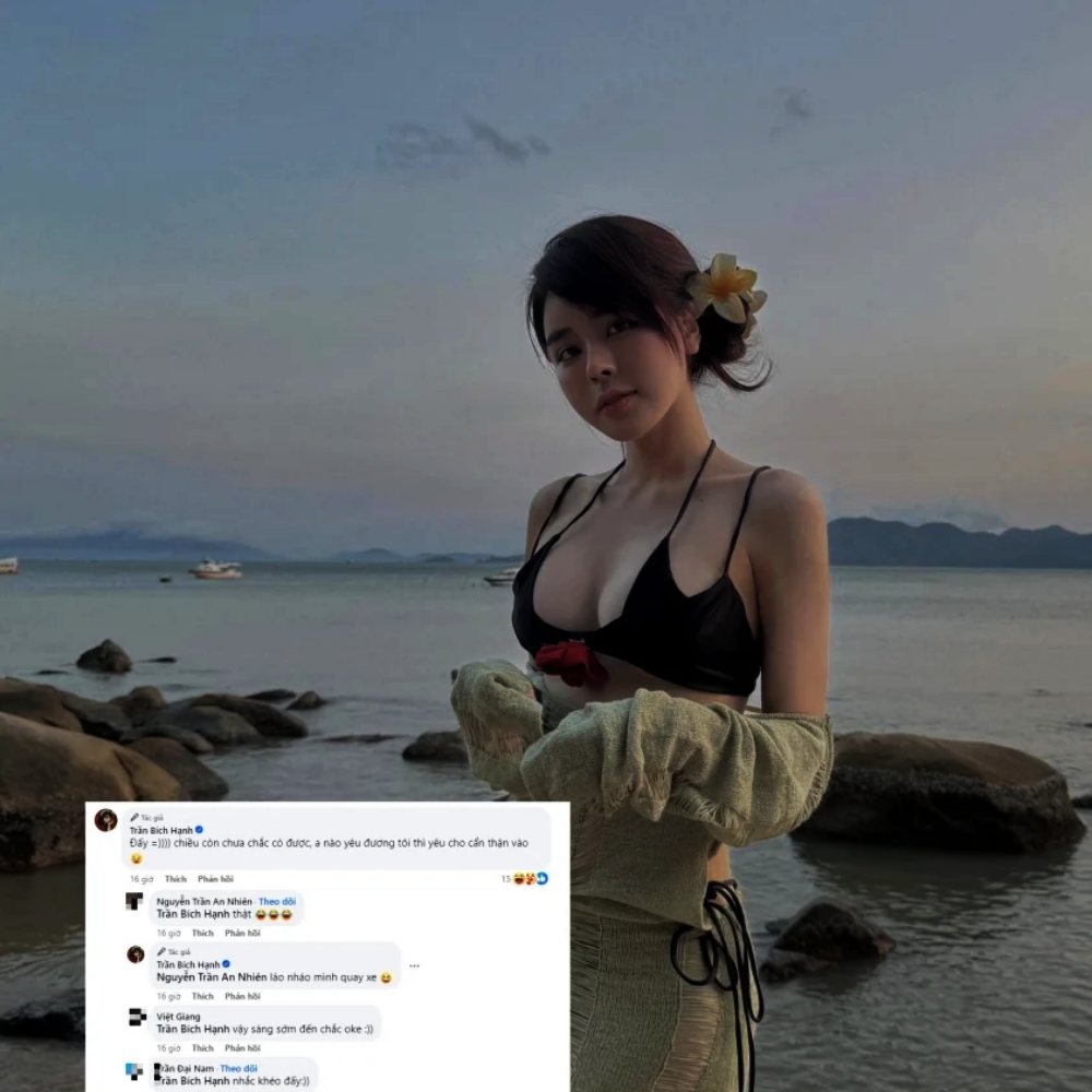 Đi kèm với khung hình gây "sốc visual", bạn gái Văn Thanh nhắc khéo trong chuyện yêu đương: "Em không giống với hoàng hôn. Chiều cũng chưa chắc có được". Ở phần bình luận, bạn gái Văn Thanh tiếp tục viết: "Đấy, chiều còn chưa chắc có được, anh nào yêu đương tôi thì yêu cho cẩn thận vào". Khi một người xem bày tỏ sự đồng tình, Bích Hạnh hài hước phản hồi: "Láo nháo mình quay xe".