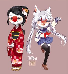 Nhật Bản là một trong những quốc gia có nhiều tai mèo và đuôi mèo nhất, phản ánh khía cạnh anime trong văn hóa của Nhật Bản và ám chỉ đến Nekomimi/Neko-chan (cô gái có tai mèo) hoặc Kitsune (cáo chín đuôi của Nhật Bản) . Cô ấy mặc một thứ gì đó tương tự như đồng phục của trường Fukuoka, với đôi giày lười màu đen (hoặc nâu), tất dài màu trắng, váy ngắn màu xanh nước biển, với áo trên cùng màu trắng và một chiếc nơ nhỏ màu đỏ tươi trên chiếc khăn quàng cổ cũng có màu xanh nước biển.