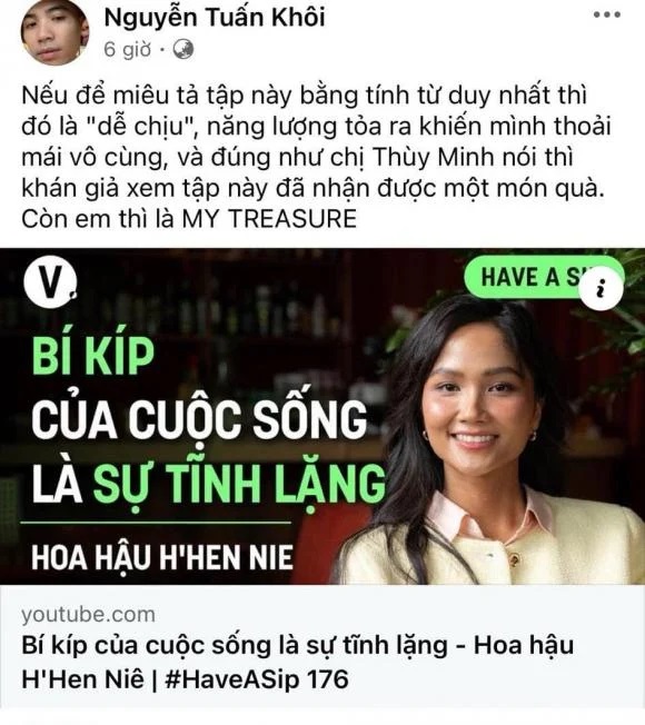 Mới đây, bạn trai H'Hen Niê chia sẻ lại một chương trình có cô là khách mời chính. Anh dành llời khen cho H'Hen Niê và gọi nàng hậu là "báu vật": "Nếu để miêu tả tập này bằng tính từ duy nhất thì đó là "dễ chịu", năng lượng tỏa ra khiến mình thoải mái vô cùng, và đúng như chị Thùy Minh nói thì khán giả xem tập này đã nhận được một món quà. Còn em thì là "báu vật của anh". Màn công khai ngọt ngào này của Tuấn Khôi dành cho H'Hen Niê đã khiến cộng đồng mạng đứng ngồi không yên.