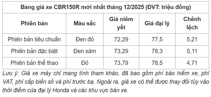 So với tháng trước, giá niêm yết của xe Honda CBR150R trong tháng 12/2025 vẫn ổn định, cụ thể như sau: Bản tiêu chuẩn đang có giá bán 72,29 triệu đồng, bản đặc biệt đang có giá bán 73,29 triệu đồng và bản thể thao đang có giá bán 73,79 triệu đồng.