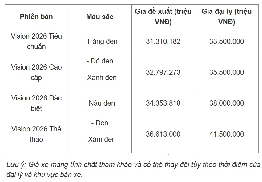 Theo ghi nhận, giá niêm yết của xe Honda Vision trong tháng 3 không có sự thay đổi so với tháng 2/2026, cụ thể: Phiên bản tiêu chuẩn đang được bán ở mức giá 31.310.182 đồng, phiên bản cao cấp đang được bán ở mức giá 32.979.273 đồng, phiên bản đặc biệt được bán ở mức giá 34.353.818 đồng, phiên bản thể thao giá 36.612.000 đồng và phiên bản cổ điển được bán ở mức giá 36.612.000 đồng.