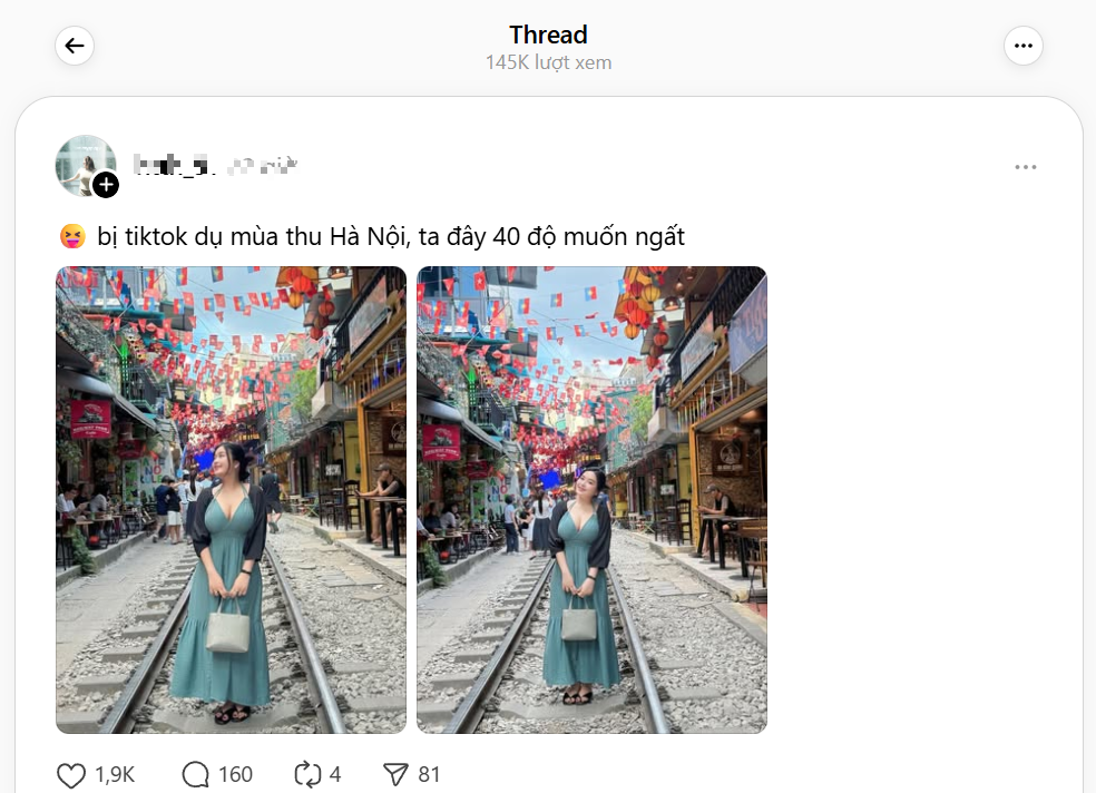 Trong không gian đặc trưng của phố đường tàu với những bức tường cũ kỹ, con hẻm nhỏ và ray xe lửa đã nhuốm màu thời gian, cô gái trẻ có tài khoản mạng là Tử Đinh Hương xuất hiện đầy nổi bật. Bài đăng khoe khoảnh khắc check-in cực phẩm của cô hút hàng trăm nghìn lượt xem và tương tác. Tại đây, cô gái chọn trang phục nàng thơ nhưng vẫn tôn lên điểm mạnh hình thể, từng động tác tạo dáng, ánh mắt, nụ cười của cô đều toát lên sự chuyên nghiệp và thần thái cuốn hút.