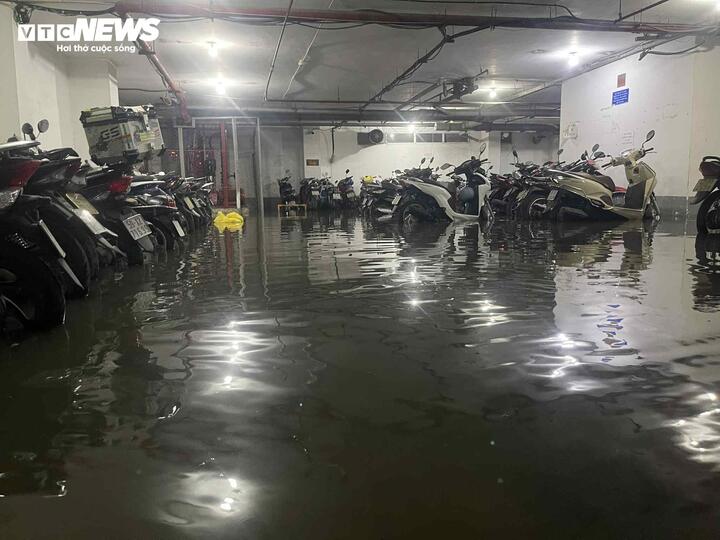 Hầm chung cư trên địa bàn phường Tam Bình, TP.HCM bị nước tràn vào sau trận mưa lớn tối 5/8.