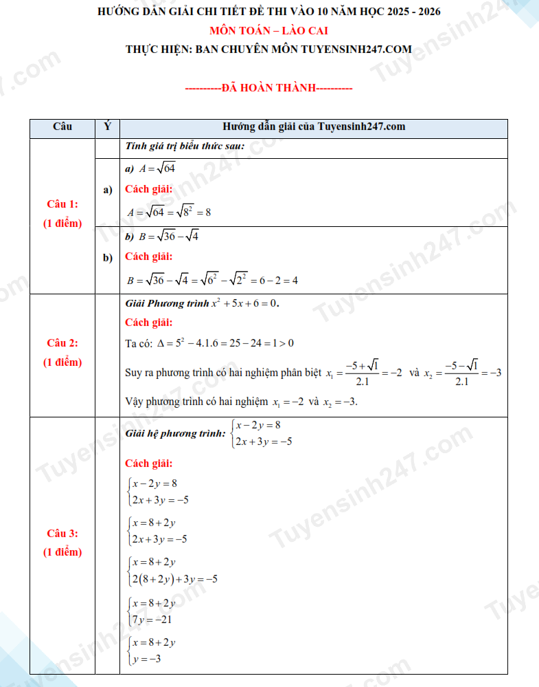 Đáp án đề thi vào lớp 10 năm 2025 môn Toán tại Lào Cai. Nguồn ảnh: tuyensinh24