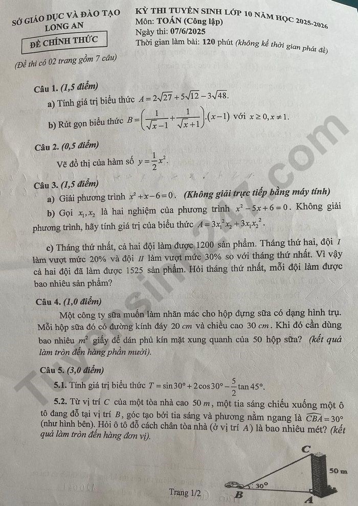 Đề thi vào lớp 10 năm 2025 môn Toán tại Long An. Nguồn ảnh: tuyensinh247