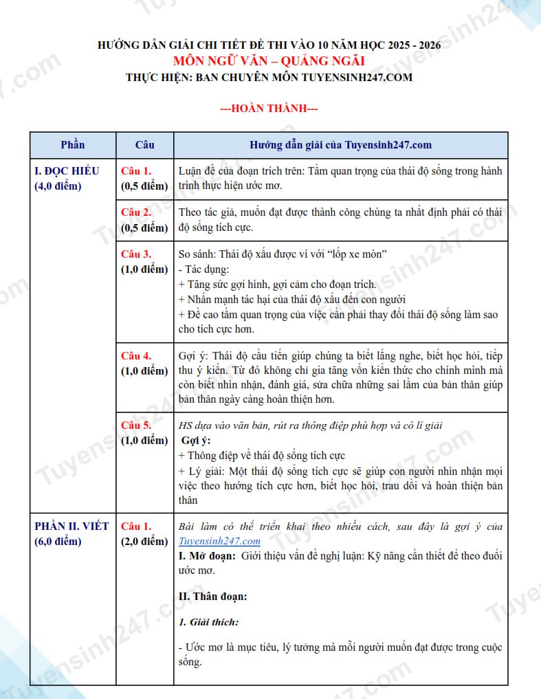 Đáp án đề thi vào lớp 10 năm 2025 môn Văn tại Quảng Ngãi. Nguồn ảnh: tuyensinh247
