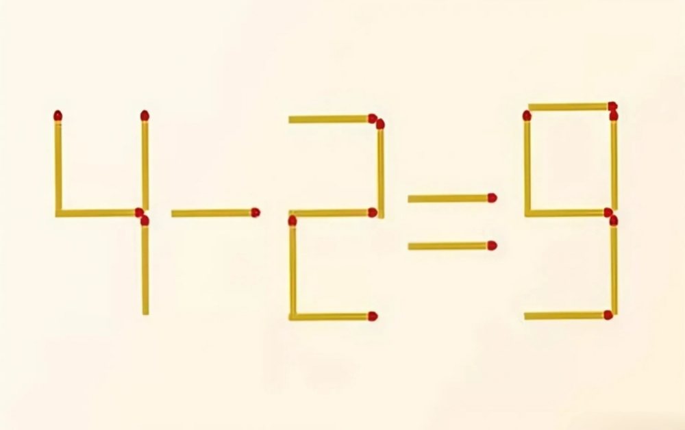 Câu đố que diêm được sắp xếp thành phép tính 4 - 2 = 9. Tuy nhiên, phép tính này không chính xác và yêu cầu người giải chỉ được di chuyển 2 que diêm để được đáp án đúng.