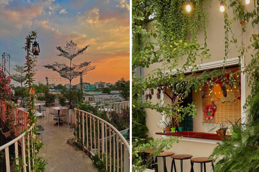 Không gian quán được thiết kế theo tone xanh và trắng, tạo cảm giác tươi mát. Phía trước có khu vườn với nhiều cây xanh, xương rồng, và những chậu đất nung cam cùng dụng cụ làm vườn. Đây cũng là nơi có nhiều góc xinh xắn cho việc sống ảo.