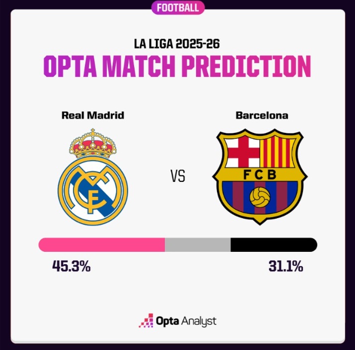 Theo 10.000 mô phỏng trước trận của Opta, Real Madrid có 45,3% cơ hội chiến thắng, Barcelona có 31,1%, và 23,6% khả năng trận đấu kết thúc với tỉ số hòa.