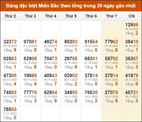 Thống kê GĐB miền Bắc theo tổng trong 30 ngày tính đến 18/11/2025