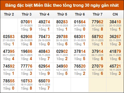 Thống kê GĐB XSMB theo tổng trong 30 ngày gần đây tính đến 20/11/2025