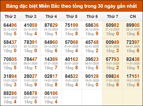 Thống kê GĐB XSMB theo tổng trong 30 ngày gần đây tính đến 22/01/2026