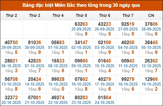 Thống kê GĐB XSMB theo tổng trong 30 ngày gần đây tính đến 25/10/2025