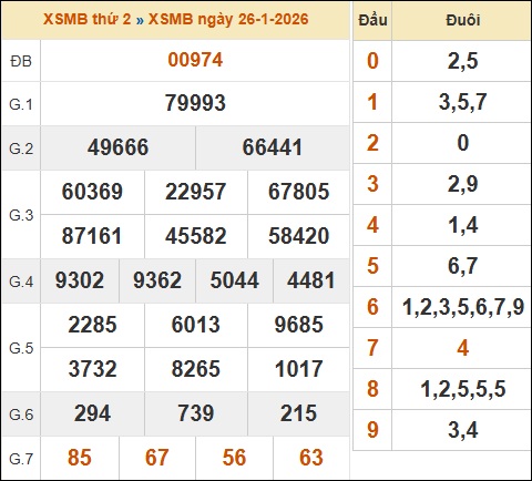 Bảng kết quả xổ số miền Bắc 26/01/2026 hôm qua