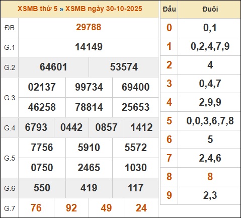 Để gia tăng cơ hội nhận định kết quả XSMB 31/10/2025 đẹp nhất hôm nay, người chơi cần tham khảo bình luận kết quả xổ số miền Bắc đã về trong kỳ trước ngày 30/10/2025 như sau: