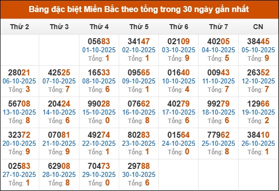 Thống kê giải đặc biệt theo tổng trong vòng 30 ngày tính đến 31/10/2025
