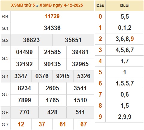 Bảng kết quả xổ số miền Bắc 04/12/2025 hôm qua