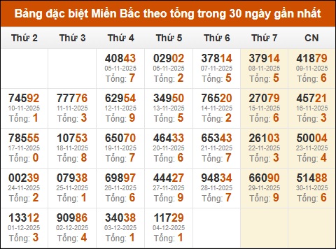 Thống kê giải đặc biệt theo tổng trong vòng 30 ngày tính đến 05/12/2025