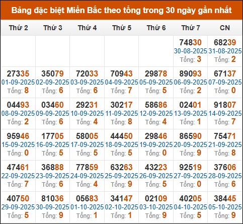 Thống kê GĐB miền Bắc theo tổng trong 30 ngày tính đến 06/10/2025