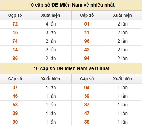 ⚡ 10 cặp số ĐB Miền Nam về nhiều nhất/ ít nhất tính đến ngày 15/09/2025: