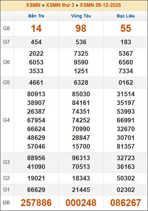 Kết quả xổ số Miền Nam 09/12/2025 thứ 3 tuần trước