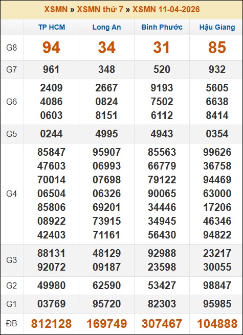 Xem kết quả kỳ trước, từ đó nhận định kết quả XSMN 18/4 hôm nay gồm 4 tỉnh: TP Hồ Chí Minh, Long An, Bình Phước, Hậu Giang.