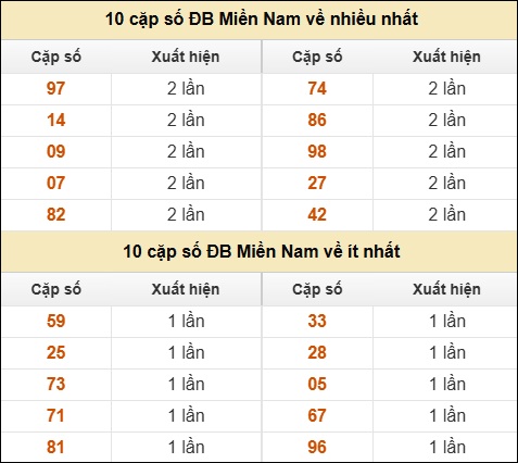 ⚡ 10 cặp số ĐB Miền Nam về nhiều nhất/ ít nhất tính đến ngày 2/10/2025: