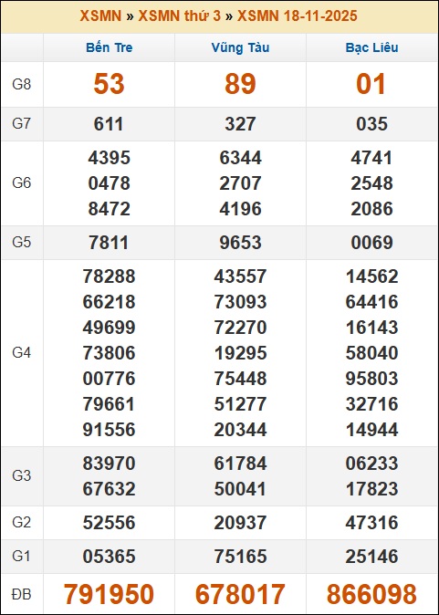 Bảng loto biên độ dài Bạc Liêu đến ngày 25/11/2025