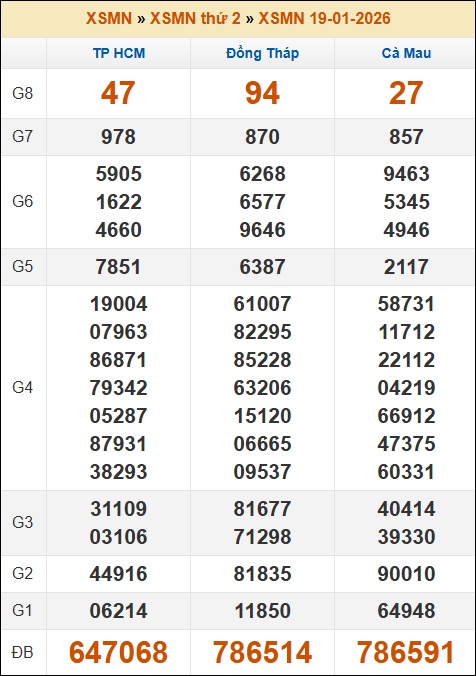 Kết quả xổ số Miền Nam 19/01/2026 thứ 2 tuần trước