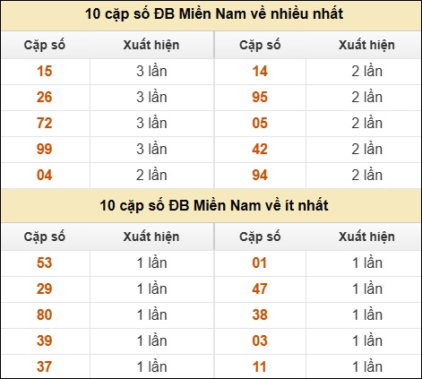 ⚡ 10 cặp số ĐB Miền Nam về nhiều nhất/ ít nhất tính đến ngày 27/10/2025: