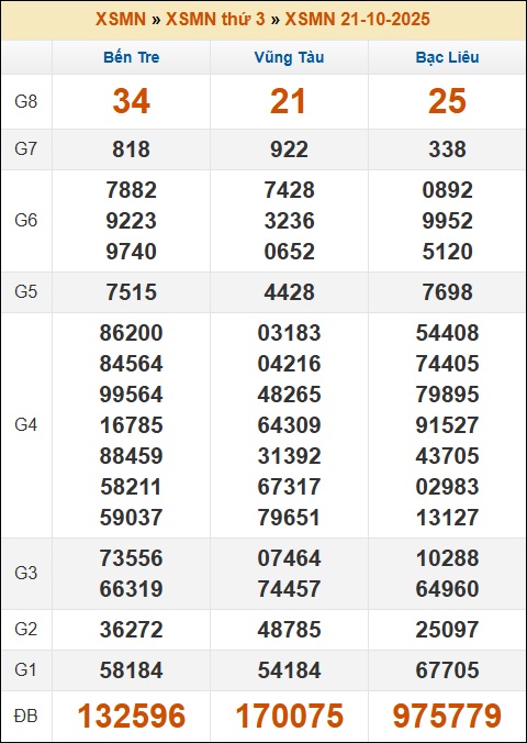 Kết quả xổ số Miền Nam 21/10/2025 thứ 3 tuần trước