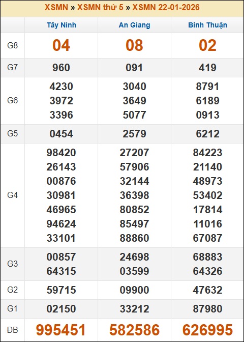 Kết quả xổ số Miền Nam 22/01/2026 thứ 5 tuần trước