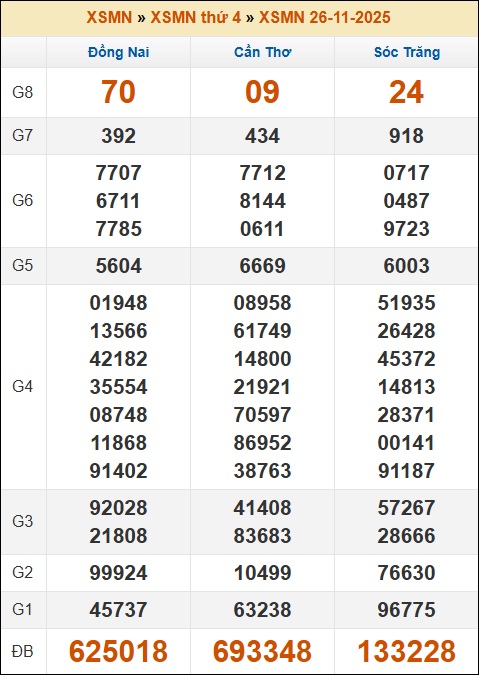 Kết quả xổ số Miền Nam ngày 26/11/2025 thứ 4 tuần trước