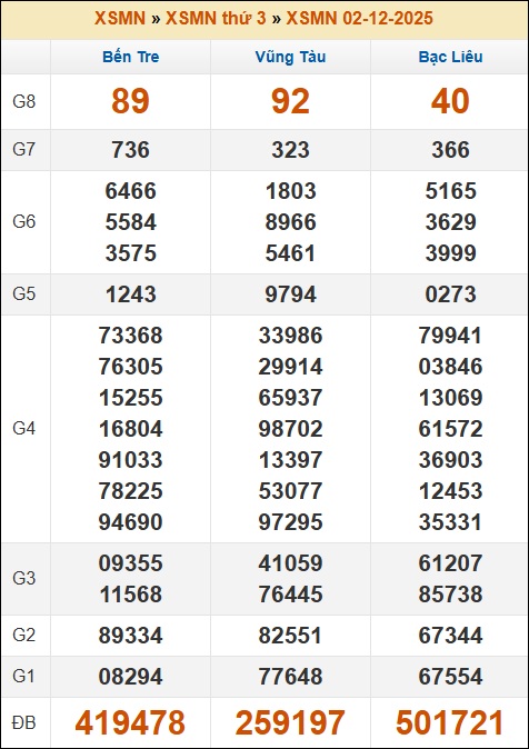 Kết quả xổ số Miền Nam 02/12/2025 thứ 3 tuần trước