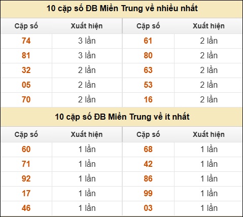 ⚡ 10 cặp số ĐB XSMT về nhiều nhất/ ít nhất tính dến ngày 01/11/2025: