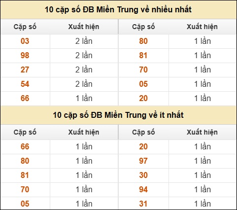 ⚡ 10 cặp số ĐB XSMT về nhiều nhất/ ít nhất tính dến ngày 13/10/2025: