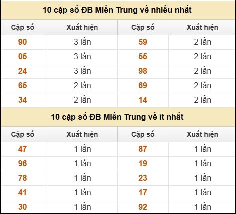 ⚡ 10 cặp số ĐB XSMT về nhiều nhất/ ít nhất tính đến ngày 15/01/2026: