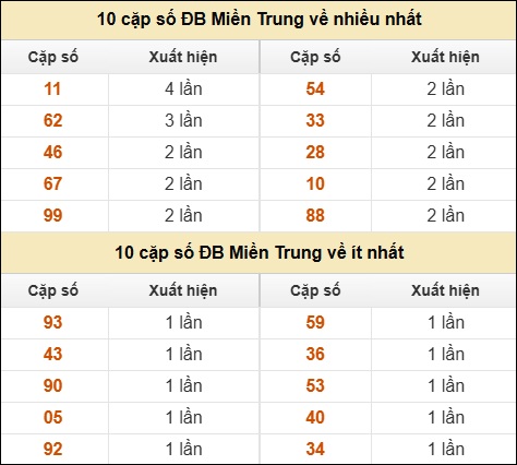 ⚡ 10 cặp số ĐB XSMT về nhiều nhất/ ít nhất tính dến ngày 15/03/2026:
