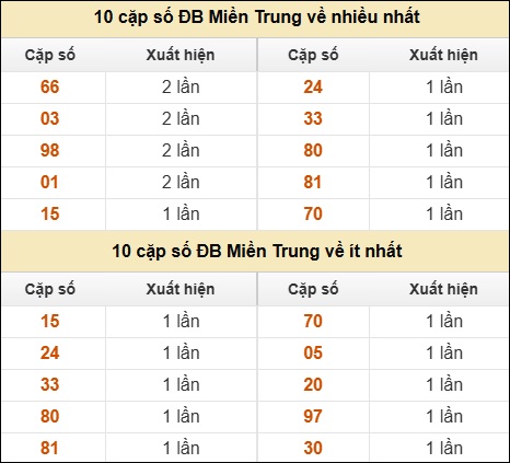 ⚡ 10 cặp số ĐB XSMT về nhiều nhất/ ít nhất tính dến ngày 15/09/2025: