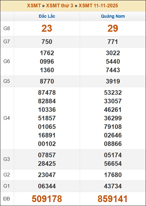 Kết quả xổ số Miền Trung 11/11/2025 thứ 3 tuần trước