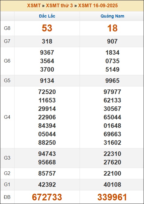 Kết quả xổ số Miền Trung 16/9/2025 thứ 3 tuần trước