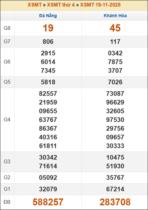 Kết quả xổ số Miền Trung 19/11/2025 thứ 4 tuần trước
