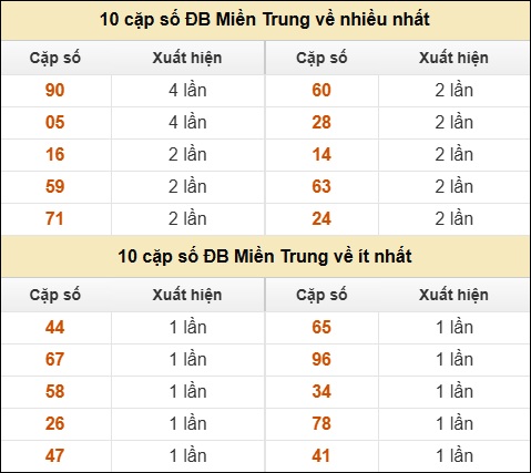 ⚡ 10 cặp số ĐB XSMT về nhiều nhất/ ít nhất tính đến ngày 04/12/2025: