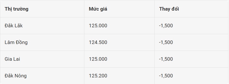 Theo cập nhật mới nhất, giá cà phê trong nước tại các thị trường chính đều ghi nhận mức giảm đồng loạt 1.500 đồng/kg. Cụ thể, tại Đắk Lắk và Gia Lai, giá cà phê hiện ở mức 125.000 đồng/kg. Tại Lâm Đồng, giá thấp hơn một chút, đạt 124.500 đồng/kg. Trong khi đó, Đắk Nông là địa phương có giá cao nhất, đạt 125.200 đồng/kg.